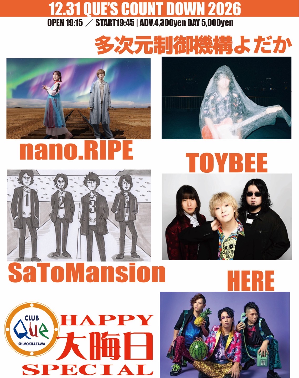 2025.12.31(水) 東京・下北沢CLUB Que QUE’S COUNTDOWN 2026 SECOND GENERATION 開場19:15 開演19:45 前売 4,300円 当日 5,000円(+1D) <出演> nano.RIPE 多次元制御機構よだか TOYBEE SaToMansion HERE サポートミュージシャン Ba 壱 Drum 角谷正史(→SCHOOL←) <チケット> Que店頭 [16:00~21:00] 10/30~