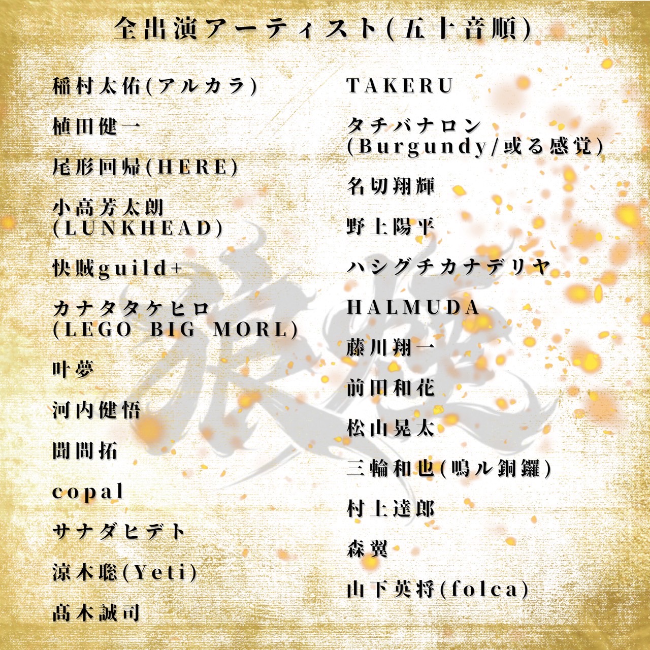稲村太佑(アルカラ) / 植田健一 / 尾形回帰(HERE) / 小高芳太朗(LUNKHEAD) / 快賊guild+ / カナタタケヒロ(LEGO BIG MORL) / 叶夢 / 河内健悟 / 聞間拓 / copal / サナダヒデト / 涼木聡(Yeti) / 髙木誠司 / TAKERU / タチバナロン(Burgundy/或る感覚) / 名切翔輝 / 野上陽平 / ハシグチカナデリヤ / HALMUDA / 藤川翔一 / 前田和花 / 松山晃太 / 三輪和也(鳴ル銅鑼) / 村上達郎 / 森翼 / 山下英将(folca) /